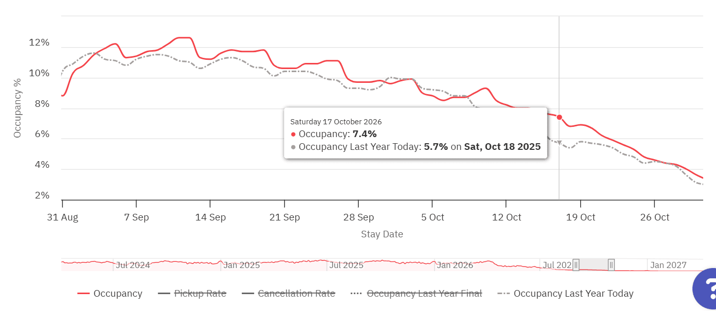 October 16 and 17 are the sharpest signal in the table, pacing 23% and almost 30% ahead respectively. Guests are locking down specific dates five months in advance.